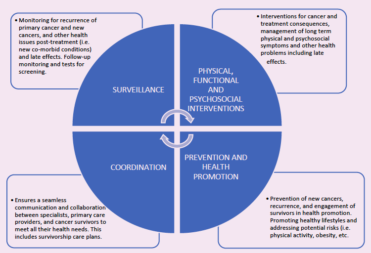 Survivorship care should start from diagnosis and extend through treatment, post-treatment remission and/or ongoing maintenance therapy for cancer control and/or living with advanced disease as a chronic illness, palliative and end of life care